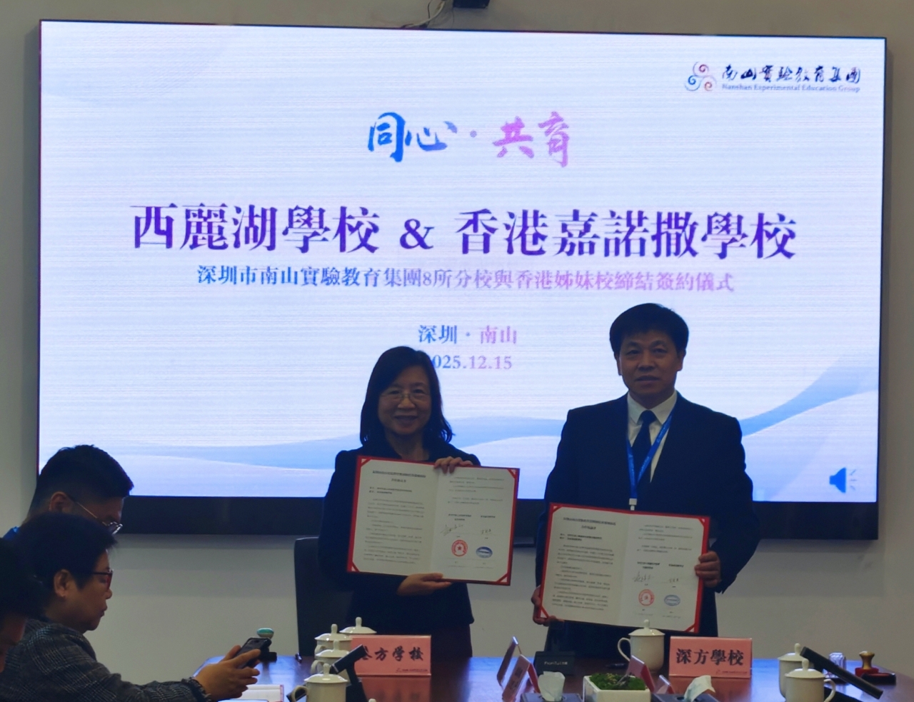 為促進粵港澳大灣區教育交流與合作,增進兩地學子相互學習,本校與深圳市南山實驗教育集團西麗湖學校於2025年12月15日(星期一)上午,在深圳市麒麟中學舉行了隆重的締結姊妹學校簽約儀式。儀式上,兩校校長代表各自學校,在友好熱烈的氣氛中簽署了姊妹學校合作協議,標誌著兩校正式建立緊密的教育夥伴關係。此次締約不僅是兩校情誼的開端,更是日後深度交流的重要基石。