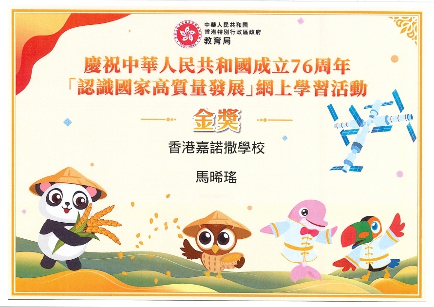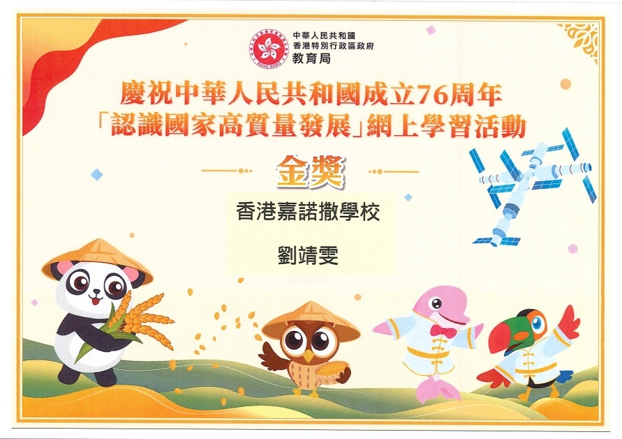為慶祝中華人民共和國成立76周年,本校學生積極參與由教育局主辦、香港教育城協辦的「認識國家高質量發展」網上學習活動。活動以網上闖關形式進行,設三關影片及問答,涵蓋航天科技、人工智能、碳中和、非物質文化遺產及「一帶一路」基建等國家新時代發展成就。學生須答對半數題目方可過關,極考驗專注與理解力。