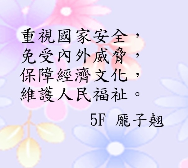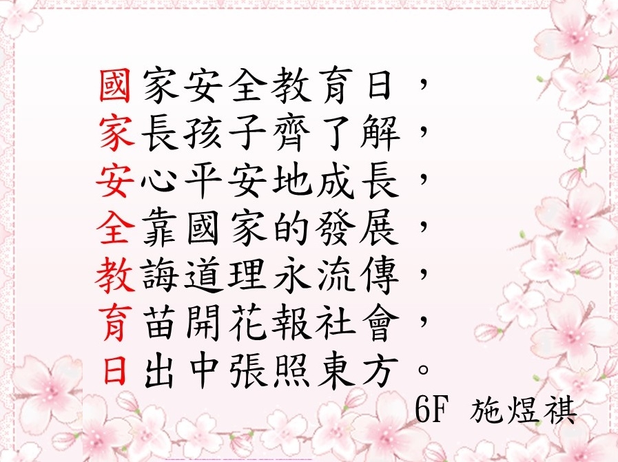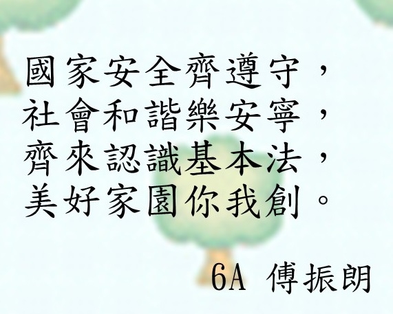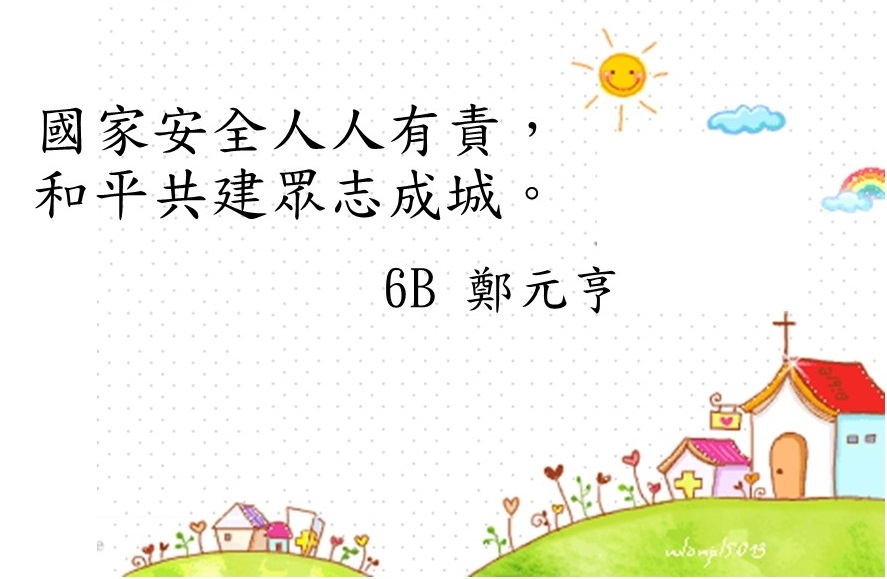 為響應四月的「國家安全教育日」,本校於四月推出一項親子活動 : 國家安全標語創作,學生與家長一同觀看有關國家安全的影片後,創作標語回應相關內容,並上載到Google Classroom「國家安全教育日親子活動:標語創作」。